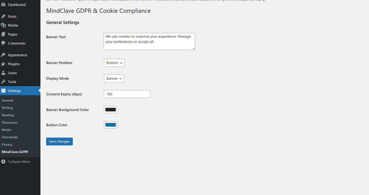 • Change plugin settings easily from the admin panel: banner text, position, colors, mode, and cookie expiry.